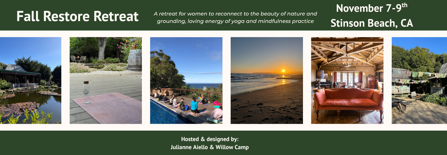 Just one hour from San Francisco, Willow Camp is a historic oceanfront property in Stinson Beach, California. Our Fall Restore Retreat (November 7–9, 2025) is a women’s yoga retreat designed to help you reset, recharge, and reconnect with yourself and nature. Nestled between the Pacific Ocean and Mt. Tamalpais, Willow Camp offers the perfect setting for a Marin County yoga retreat — with sweeping coastal views, serene gardens, and cozy accommodations.